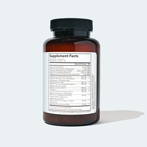 Our formula contains four ingredients that are popularly known as adaptogens — ashwagandha, lion’s mane mushroom, rhodiola, and saffron. We also include several other ingredients that, though not widely regarded as such, nonetheless produce effects that could be described as adaptogenic.