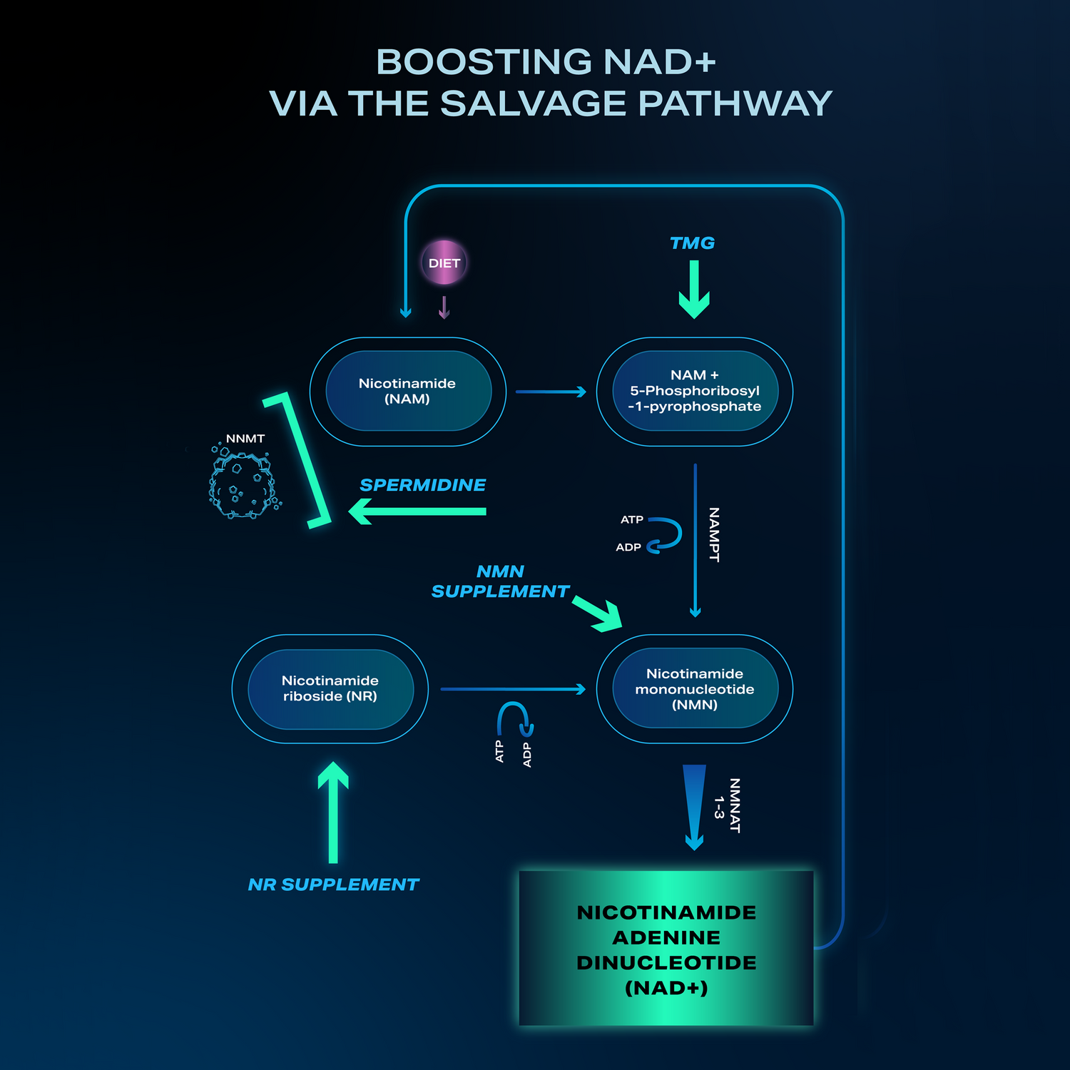 Not only that, but the complexities of the salvage pathway mean that these precursors can use a helping hand to achieve their greatest effects. Our inclusion of TMG prevents methyl-donor depletion that otherwise inhibits NAD+ boosting, while spermidine optimizes the pathway by keeping crucial NAD+ building blocks from being taken away.