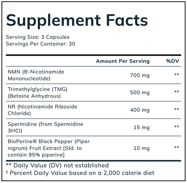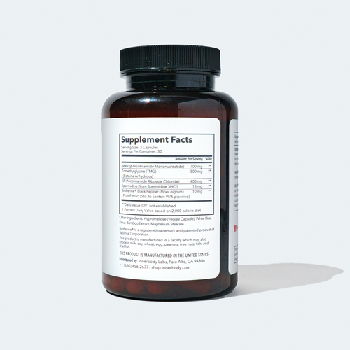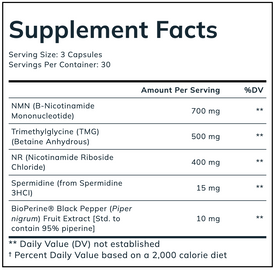 Not only that, but the complexities of the salvage pathway mean that these precursors can use a helping hand to achieve their greatest effects. Our inclusion of TMG prevents methyl-donor depletion that otherwise inhibits NAD+ boosting, while spermidine optimizes the pathway by keeping crucial NAD+ building blocks from being taken away.